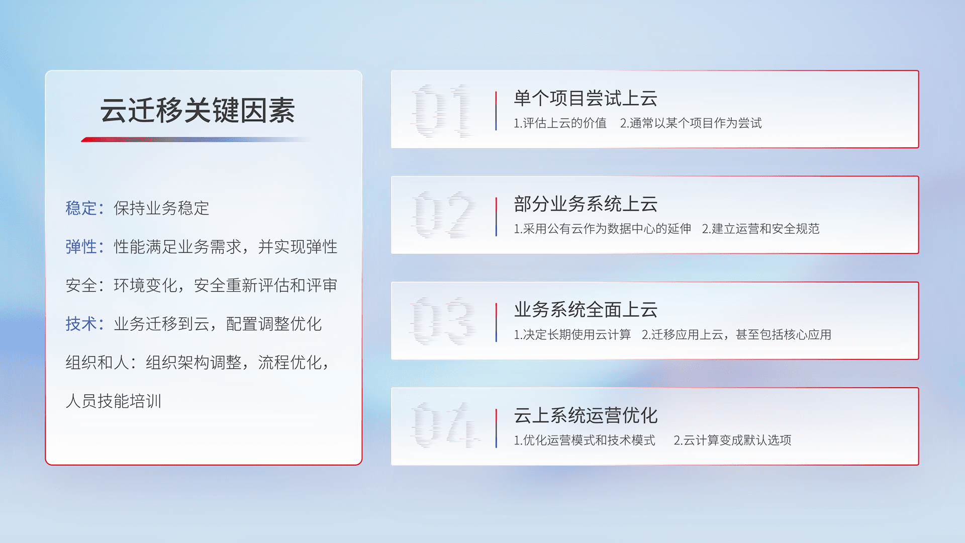 结合实际业务,,从规划设计、、、、云平台选型、、、、云原生改造、、、、数据迁移、、集成交付,,,,迁移全过程为客户识别最佳上云路径,,,做好风险识别管理,,设计网络架构、、身份权限、、安全审计合规、、、、操作审计、、、、日志审计、、、监控告警策略、、、多站点容灾设计等,,,对云上基础设施进行整体规划,,,,提升IT治理水平,,,,以满足弹性、、、高可用、、、、高性能的需求。。。。